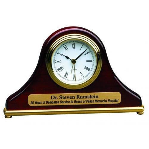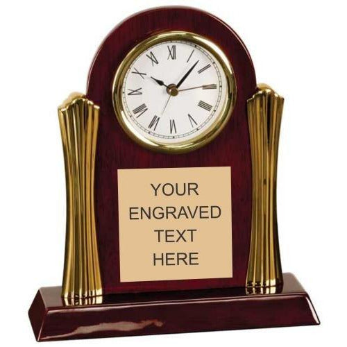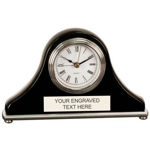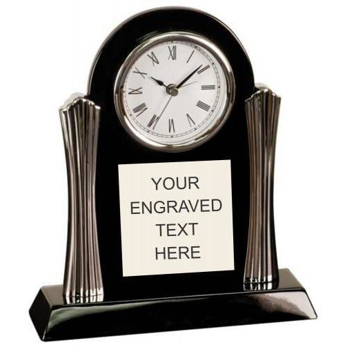 This elegant desk clock features an arched piano finish clock framed on 2 sides by ornate metal columns. There is ample room on the front of the cl...