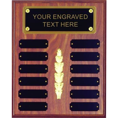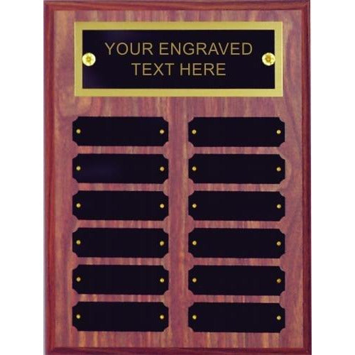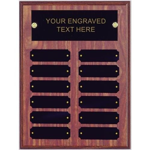An Elegant 9" x 12" Walnut Finish Perpetual Plaque displaying 12 individual plates. FREE Engraving of all Text Perpetual Plaques Production le...