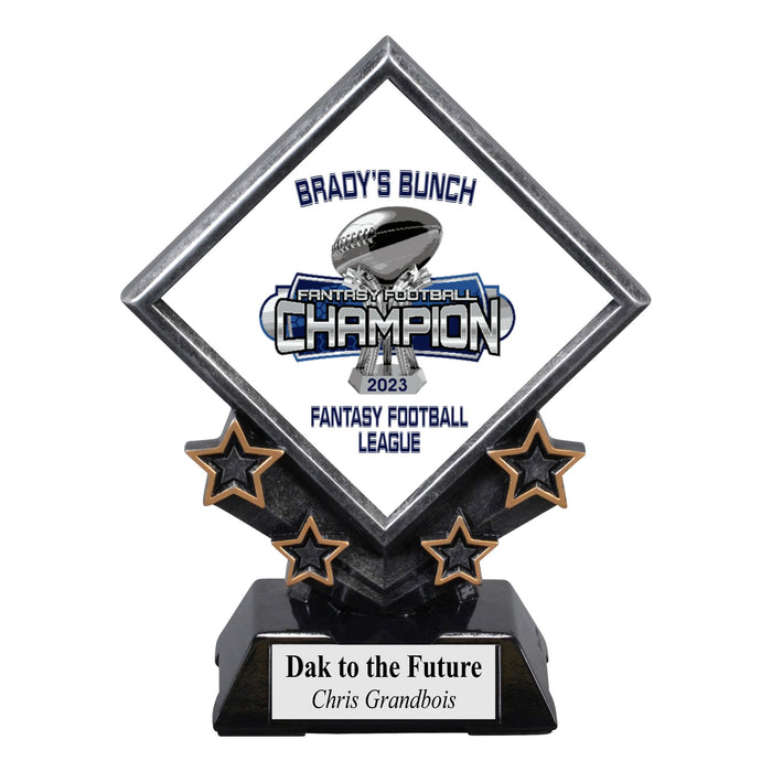 The ultimate keepsake trophy that recognizes a victorious season to a manager or a commissioner. This 9" Resin Statue trophy displays the custom Lombardi trophy graphic, you can add the Fantasy Football League name around the image and the year goes on the base of the trophy graphic. Finish this award off with the Team Name recipient engraved on the base, price includes engraving on base.
