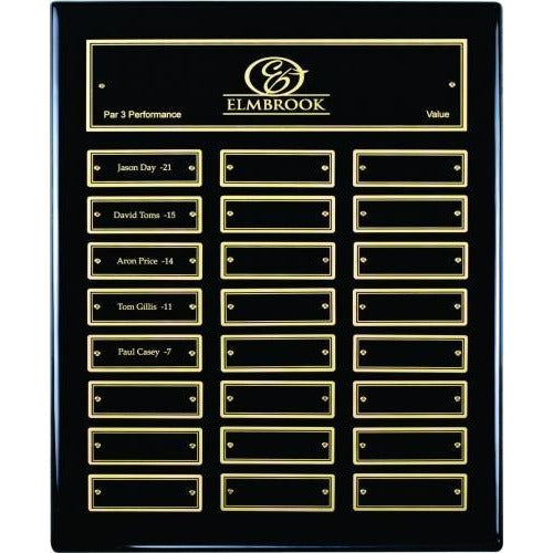 High Gloss Ebony Perpetual Corporate Plaque with Black/Gold Header Plate and matching Individual Plates. Available in 12" x 15" with 24 plates or 9" x 12" with 12 plates.