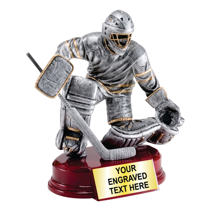 Hockey goalie trophy sculptures are the perfect award for school and sporting events. Featuring a rosewood colored base and antiqued silver sculpture, this hockey goalie award is the perfect way to recognize accomplishments! Available in 2 sizes.