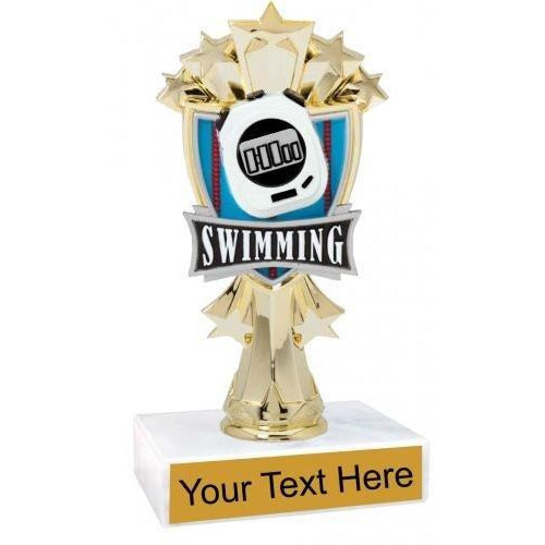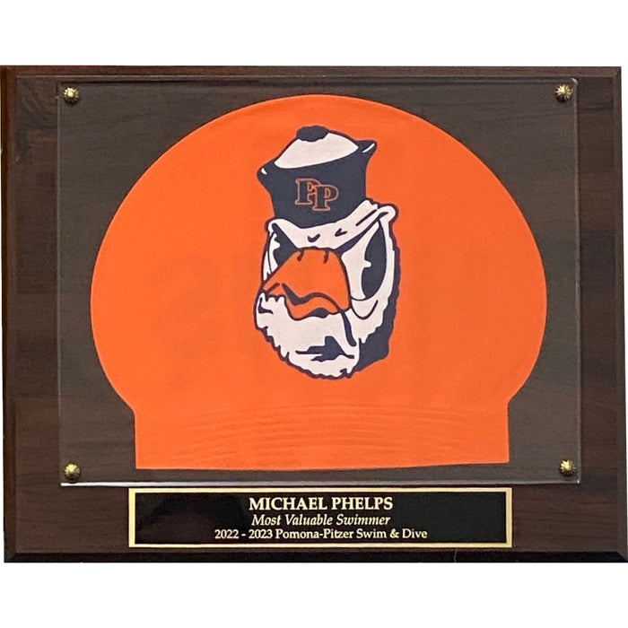 Looking for swim award ideas? Look no further! This custom swim cap plaque is the unique swim award every competitor in the pool would love. Having the recipients specific team swim cap permanently affixed to this elegant plaque will allow them to forever cherish that special season or individual/team accomplishment! A beautiful 10 1/2" x 13" cherry finish plaque displays your swim cap within an 8 1/2" x 11" plexiglass cover with gold rosette nails in the corners for the finishing touch. The personalized engraving can hold all requested text such as swimmer's name, award title, swim team and year. This swim cap plaque covers it all!